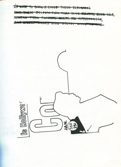 The formats of the translation process shown in Berrigan's notebook for the poems To Carlos Drummond de Andrade and A Paul Valery are very similar, where the original, typed copy of the poem is cut-out into separate stanzas and are pasted on the left side of the notebook, and the translation is hand-written by Berrigan on the right side. On the left side, there are notes on the sides and arrows between stanzas written directly on the original version of the poem. If you look close, you'll notice that each word often has its translation written right above the original language, which suggests that Berrigan and Brotherston often translated poems word-by-word. For To Paul Valery, there is a translation that is cut-out and pasted on the right side of the poem in Brotherston's handwriting. This implies that Berrigan and Brotherston worked collaboratively and that Berrigan has possibly made modifications to Brotherston's translations. On the right side, all of the translations are written in Berrigan's handwriting. The two poems are accompanied by sketches on the side, which seem to represent scenes from the poems; umbrellas in To Carlos Drummond de Andrade and "man on the beach" in To Paul Valery. These sketches imply that Berrigan tried to visualize the poems while making these translations. In addition, many of the words are being crossed out and re-written, which suggests that their translation process involved multiple modifications before reaching the final published versions.