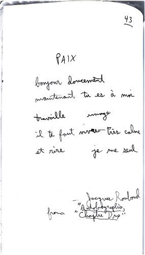 Outside of the book River under the House, Berrigan leaves his work of translations on two other poems in another notebook: Peace and JJ, which are both written by Jacques Roubaud. Berrigan’s strong interest in translating poems is apparent, as these works are not published. According to Literature Online biography, Berrigan mentions that when one is imitating someone’s poem, “the good parts will come out of where you misunderstand entirely what the poet you are imitating is doing” and that “misunderstanding is one of the truly creative procedures in writing.” This remark suggests the possibility that Berrigan’s appreciation in what comes out of misunderstanding pushed him to explore the field of translation.